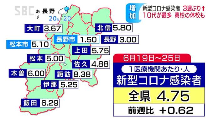 長野県内の新型コロナウイルスの感染者は1医療機関あたり4.75人で3週間ぶりに増加しました。