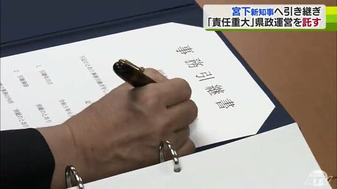 午前中には知事のバトンを手渡す宮下宗一郎新知事への引き継ぎが行われ、2人が署名を交わして今年度の予算や県有財産、各部局の業務が宮下新知事に託されました。