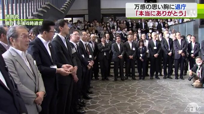 そして、午後4時15分、三村知事が県庁をあとにするとき、正面玄関の前には職員や歴代の秘書が詰めかけました。
