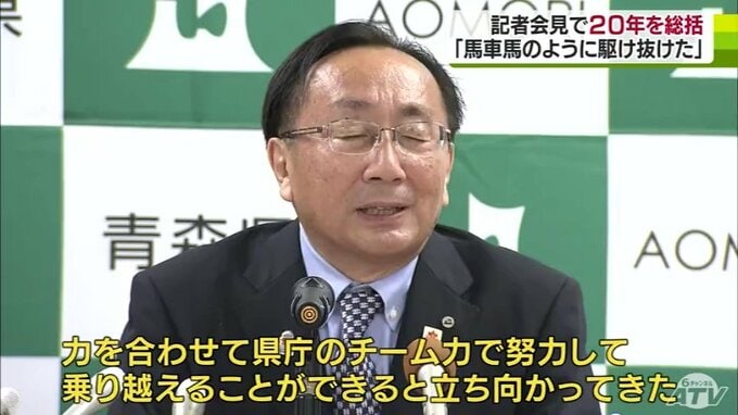※三村申吾知事「忍耐、忍耐、努力、努力。まさに20年間、馬車馬のように駆け抜けたがそれぞれの課題に対してどのような大きな壁であっても力を合わせて県庁のチーム力で努力して乗り越えることができると立ち向かってきた」
