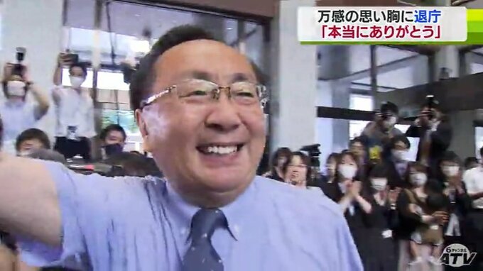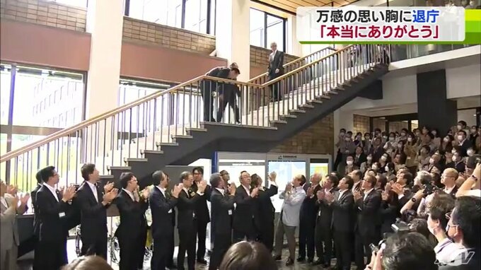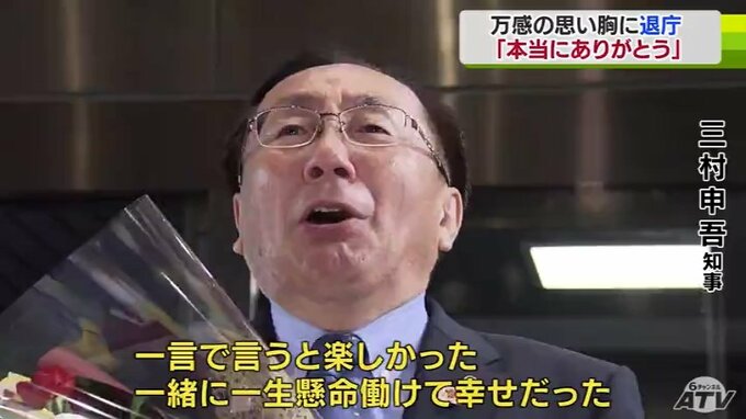 ※三村申吾知事「最高のチームと最高にいい仕事ができた。一言で言うと楽しかった。一緒に一生懸命働けて幸せだった。ほんとうにありがとう県庁の諸君。感謝してます、ありがとう」