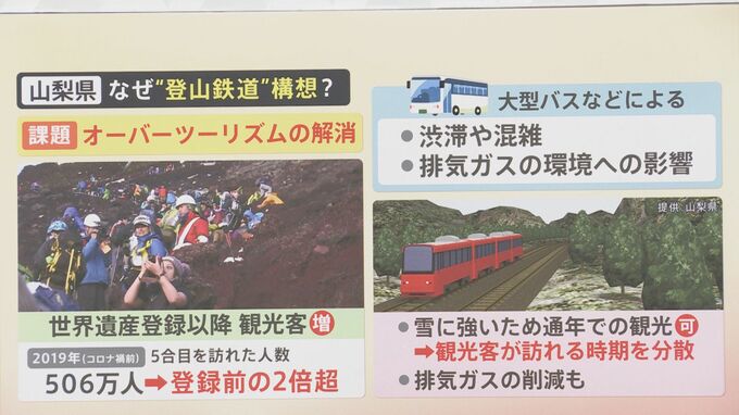 なぜ富士山に登山鉄道が必要なのかというと、観光地で最近言われている「オーバーツーリズム」の解消。近隣の住民が迷惑を被ったり、自然環境破壊などが富士山でも問題になっています。特に世界遺産登録以降、富士山の観光客はものすごく増えています。2019年に5合目の来訪者数は506万人。世界遺産登録前の2倍超の来訪者数です。