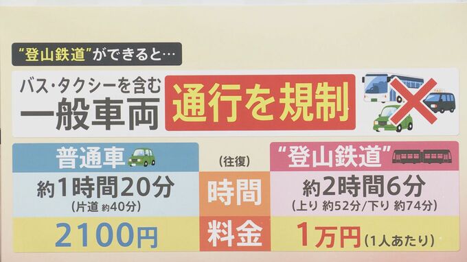 ただ“登山鉄道”ができると「バス・タクシーを含む一般車両の通行規制をする」ということになります。現時点で普通車で5合目まで行くと▼往復約1時間20分(片道40分)▼往復料金2100円となります。