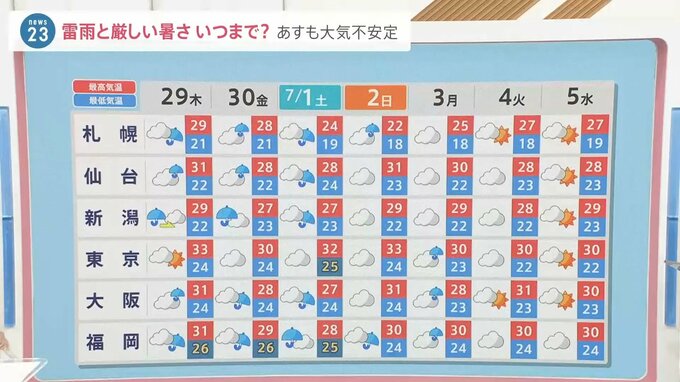 29日は局地的な雷雨が多いんですけれども、6月30日、7月1日頃にかけては今度、日本海側を中心にまとまった雨になってきそうです。この先一週間、東京は曇りの予報ですが、にわか雨は起こりやすいという状況です。何と言っても暑さが続き、気温が高いです。