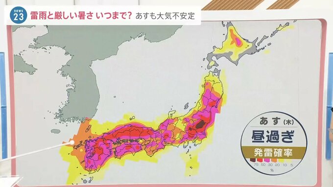 西日本は山沿い中心ですけれども、関東は北部平野部も含めて、内陸を中心に雷の発生する確率が高くなっています。特に午後は注意です。