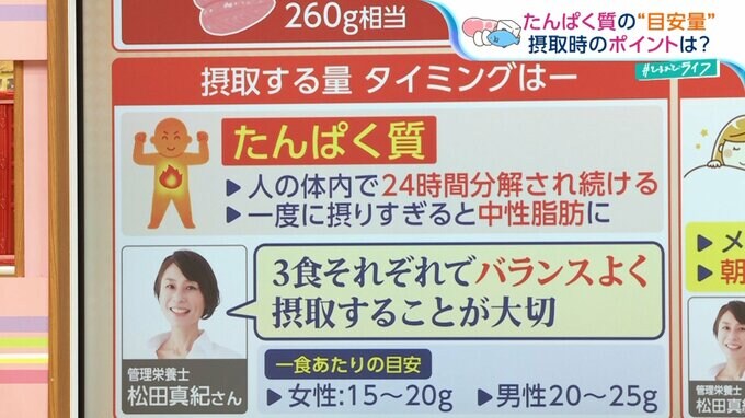 たんぱく質は人の体内で24時間分解され続けるもので、一度に摂りすぎると中性脂肪になってしまいます。必要な60gを晩ごはんだけで摂ればいい、というものではなく、3食それぞれでバランスよく摂取することが大切なのです。