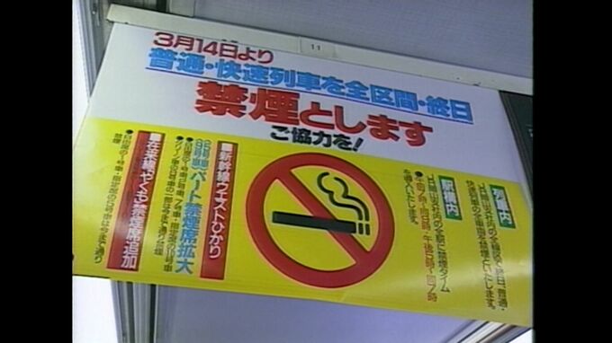 なんと、3月14日のダイヤ改正の日は【画像⑩】のように「ニューデザイン・サンライナー」の出発式も行われていました。当時の原稿によると、【画像⑪】の中吊り広告にあるように、この日から岡山支社管内は快速と普通列車が禁煙に。
