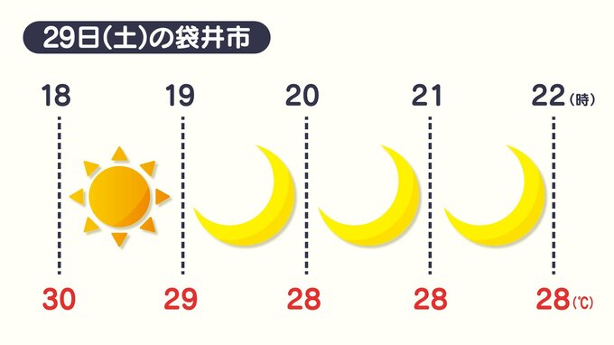花火当日は雨の心配はありません。ただ、湿度は70~80%あるため、ムシムシとした夜になりそうです。さらに午後6時でも気温は30℃、吹く風も比較的弱く、会場は熱気がたまりそうですので、通気性のいい服装で水分補給はしっかりとしましょう!浴衣で!と考えているみなさんはぜひ首元を冷やせる対策を取って、花火を楽しみましょう!
