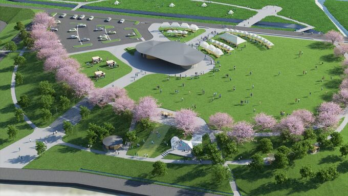 「まびふれあい公園」は、真備地区の小田川沿い約4.5ヘクタールで整備が進められていて、防災研修やマルシェなどのイベントを行うことができるとともに、災害時は避難場所として利用できます。名前には、親しみやすさと交流というコンセプトが込められました。