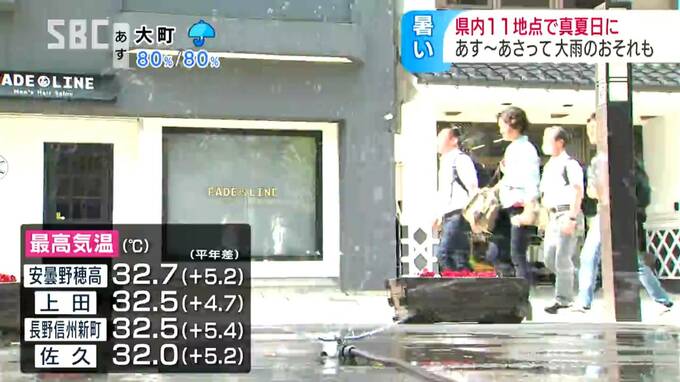 29日の最高気温は、安曇野市穂高で32.7度、上田と長野市信州新町で32.5度など県内11の地点で真夏日となりました。