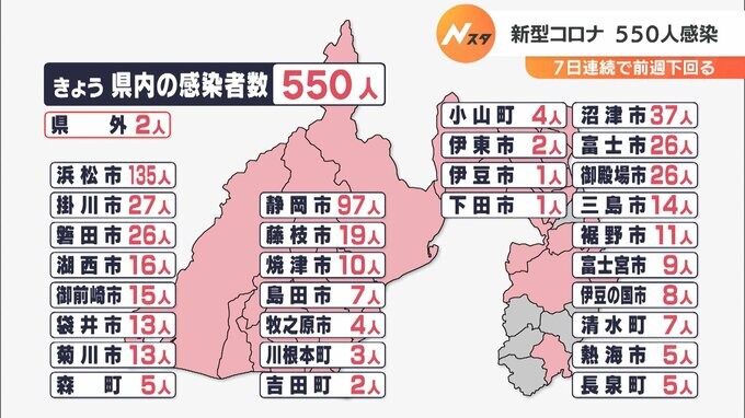 きょう29日、静岡県内では新たに550人が新型コロナウイルスに感染したことが分かりました。1日あたりの感染者数は7日連続で前の週の同じ曜日を下回りました。新たな感染者を自治体別にみますと、浜松市135人、…