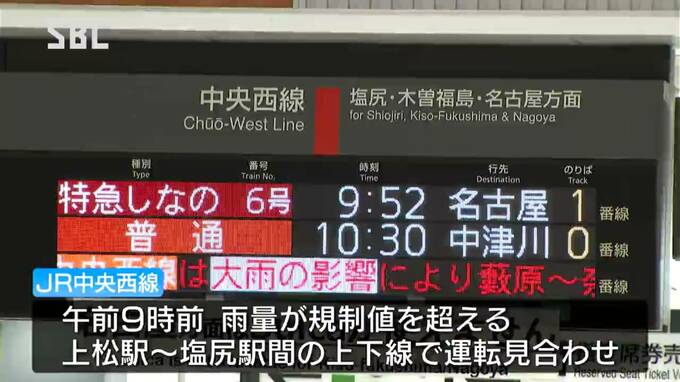 JR東海によりますと、この雨の影響で、中央西線は、午前9時前に雨量が規制値を超えたため、上松駅と塩尻駅の間の上下線で運転を見合わせています。