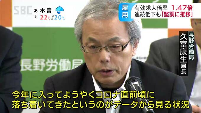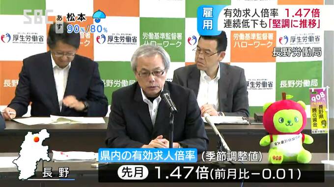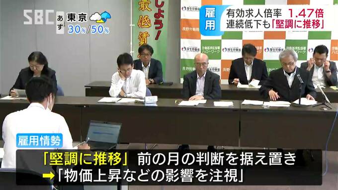 長野県内の5月の有効求人倍率は1.47倍で、2か月連続で低下しました。