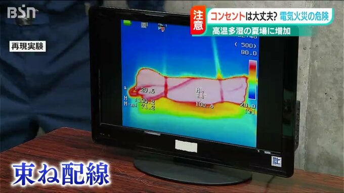 ドライヤーなどを使う際に熱がこもり、発火につながる『束ね配線』などについて注意を呼び掛けました。
