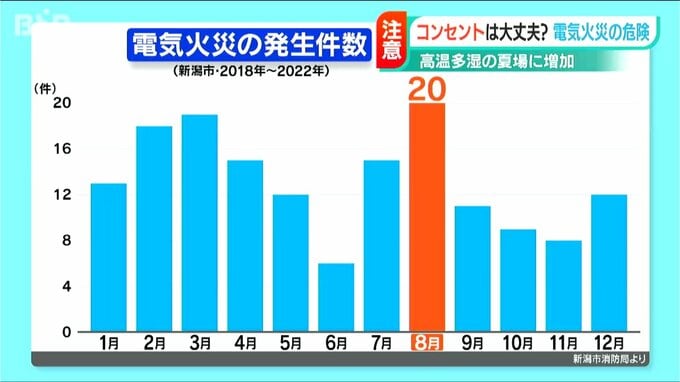 消防によりますと、過去5年間に新潟市で発生した火災のうち、『トラッキング』のような電気に関連した火災の発生件数を月別に調べたところ、8月が最も多くなりました。