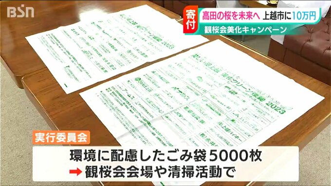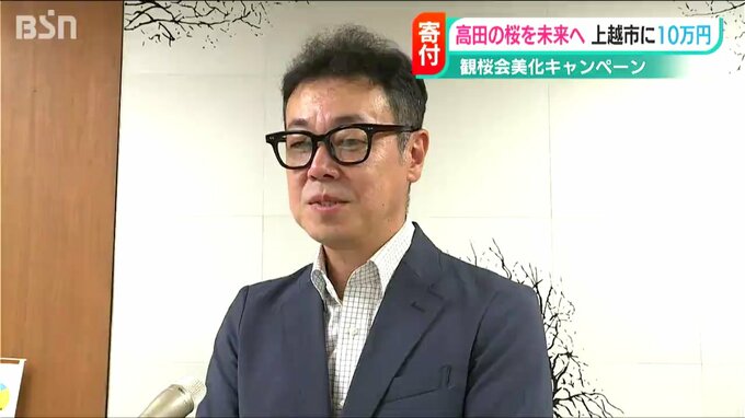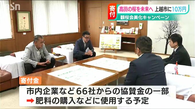 上越市に10万円を寄付したのは「観桜会美化キャンペーン」の実行委員会です。市内の企業を中心とした66社から寄せられた協賛金の一部で、高田城址公園の桜を保全するため、肥料の購入費用などに充ててほしいとしています。