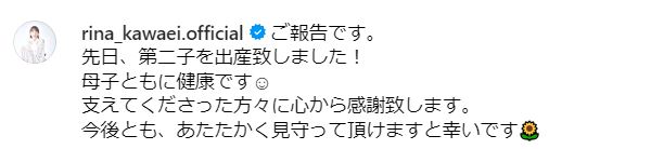 川栄さんはインスタグラムで「ご報告です。先日、第二子を出産致しました!」と知らせました。