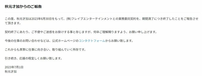 秋元さんは「この度、秋元才加は2023年6月30日をもって、(株)フレイブエンターテインメントとの業務委託契約を、期間満了につき終了したことをご報告させて頂きます」と明らかにしました。