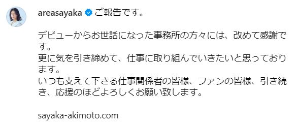 「契約終了にあたり、ご不便やご迷惑をお掛けする事と存じますが、何卒ご理解賜りますよう、お願い申し上げます」と周囲への配慮を示しつつ、「今後の仕事のお問い合わせなどは、秋元才加公式ホームページのコンタクトフォームからお願い致します」と、円滑な移行を呼びかけています。