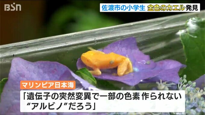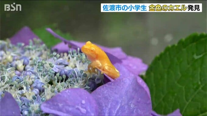 アジサイの上で輝いているのは金色のアマガエルです。6月30日、佐渡市新穂瓜生屋で発見されました。小学2年生の土屋福将くんが、帰宅した際に自宅のブロック塀にくっついているのを見つけ、捕まえたということです。