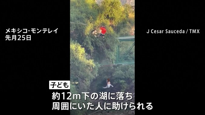 メキシコでジップライン中の子どもが落下。その瞬間がとらえられていました。ジップラインを楽しむ2人。徐々にスピードが落ち、止まってしまったかと思ったところ…。ロイター通信などによりますと、これはメキシ…