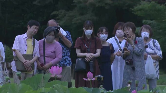 岡山市北区の後楽園で夜明けにハスの開花を鑑賞する「観蓮節」が行われました。