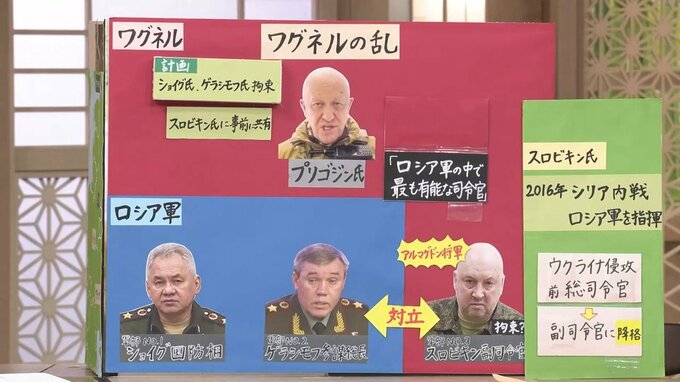 今回の「反乱」で、プリゴジン氏はショイグ氏やゲラシモフ氏の拘束も計画していたとされ、こうした考えをプリゴジン氏は事前に、スロビキン氏に伝えていたとも報道されています。
