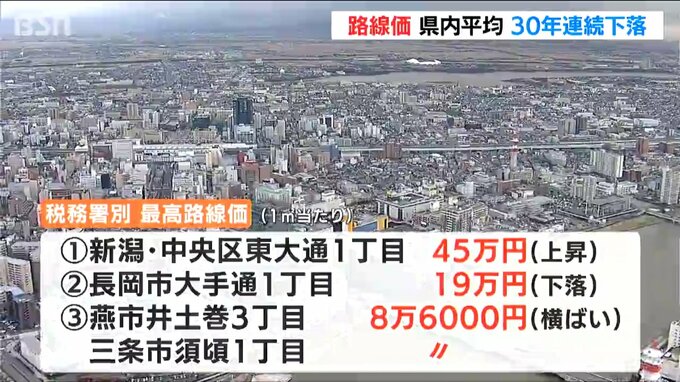 税務署別の最高路線価で最も高かったのは1平方メートルあたり45万円だった新潟市中央区東大通1丁目で次いで19万円の長岡市大手通1丁目、3番目が8万6000円の同額で燕市井土巻3丁目と三条市須頃1丁目でした。