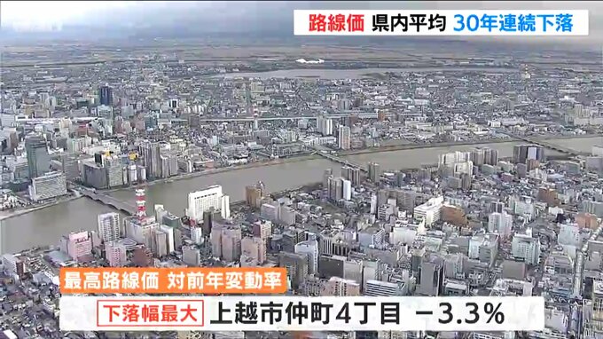 このほか、燕市や三条市、新潟市秋葉区、新発田市、十日町市、佐渡市の6地点は横ばいで、長岡市や上越市、糸魚川市、柏崎市、小千谷市、村上市の6地点では下落しました。下落幅が最も大きかったのは上越市仲町4丁目でマイナス3.3パーセントでした。