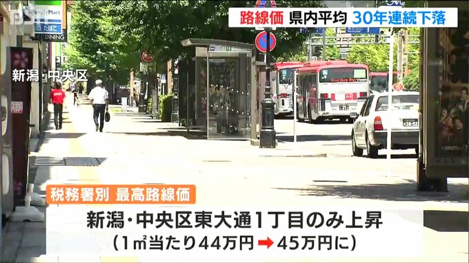 税務署別の最高路線価をみると、県内では唯一新潟市中央区東大通1丁目の「新潟駅前通り」が上昇し1平方メートルあたりの価格は22年と比べて1万円上がり、45万円となりました。
