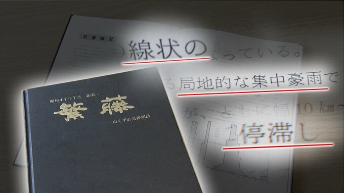その想定外を引き起こした雨について、記録をまとめた冊子には、「局地的な集中豪雨」「線状」「同じ場所に停滞」などという、今の豪雨にも通じる言葉が使われていました。