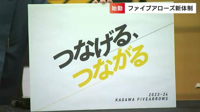 高松市で会見を行った香川ファイブアローズは、「地域とのつながりをより深めていこう」と、新シーズンのスローガンを「つながる、つなげる」としました。