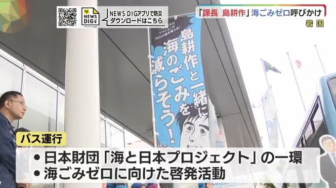 漫画の人気キャラクター「課長 島耕作」が海ごみゼロを呼びかけるバスが、山口県岩国市内を走ることになり、出発式がありました。