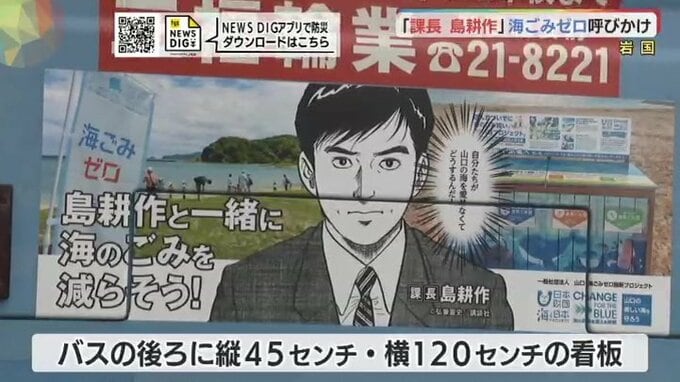 バスの後ろに縦45センチ、横120センチの看板が描かれ、島耕作が「自分たちが山口の海を愛せなくてどうするんだ」と訴えています。