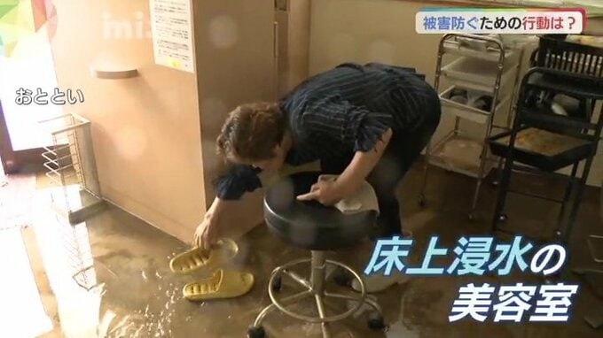 床上浸水した美容室では、店内に押し寄せた泥水を外に出す作業が行われていました。