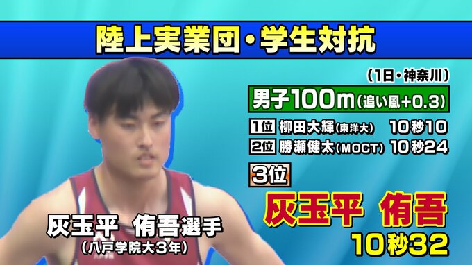 また男子100メートルには八戸学院大の灰玉平侑吾選手が出場して10秒32で3位に入りました。