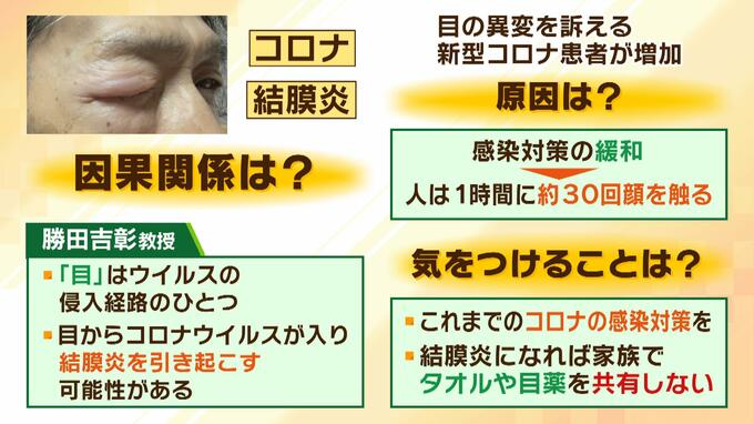 ーーここから関西福祉大学の勝田吉彰教授の解説です。目の異変を訴える患者さんについて、勝田教授は「目はウイルスの侵入経路の一つである。目からコロナウイルスが入り、結膜炎を引き起こす可能性はある」という見解ですね?