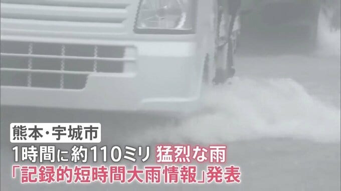 雨に煙る街で、車は冠水した道路をおそるおそる走ります。歩行者は膝下まで浸かりながら前に進むしかありませんでした。熊本県・宇城市付近では、1時間におよそ110ミリの猛烈な雨が降り「記録的短時間大雨情報」が発表されました。