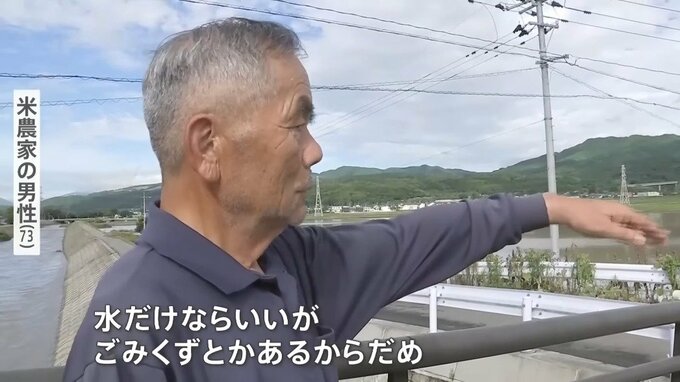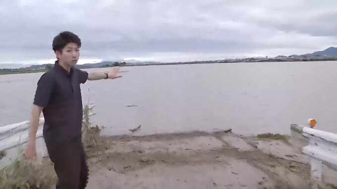 「地元の方によりますと、この道路も午前中は冠水していたということです。水が引いた今も泥が残っています。そして、この先には、もともと道路と水田が広がっていましたが、その元の姿が想像できないくらいに今も泥水が残っています」