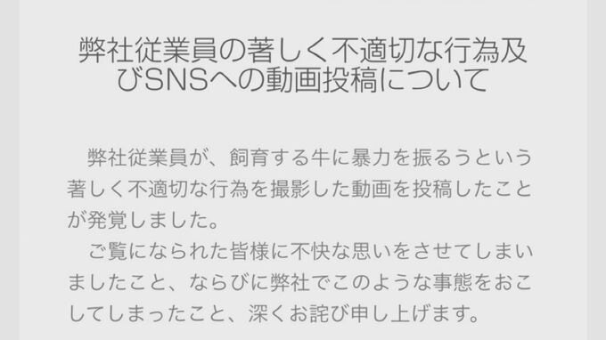 農場は6月14日、ホームページに「弊社従業員の著しく不適切な行為及びSNSへの動画投稿について」としたコメントを掲載。乳牛への虐待があったことを認め謝罪していました。