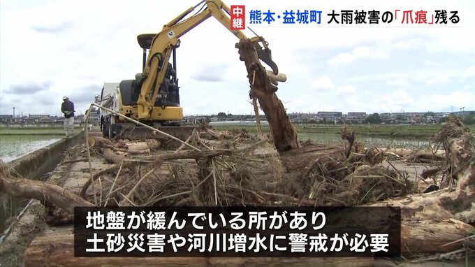 きのう線状降水帯が2度発生した熊本県では、川の氾濫で田畑が広範囲で冠水しました。水がひき、後片付けが始まった益城町から中継でお伝えします。益城町を流れる木山川に来ています。きょうの天気はきのうとは打…