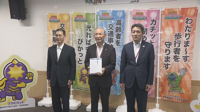 福島県警察本部で行われた贈呈式ではJA共済連福島の服部道夫本部長から、県交通安全協会の小櫻輝会長と県警察本部の児嶋洋平本部長にのぼり旗が渡されました。