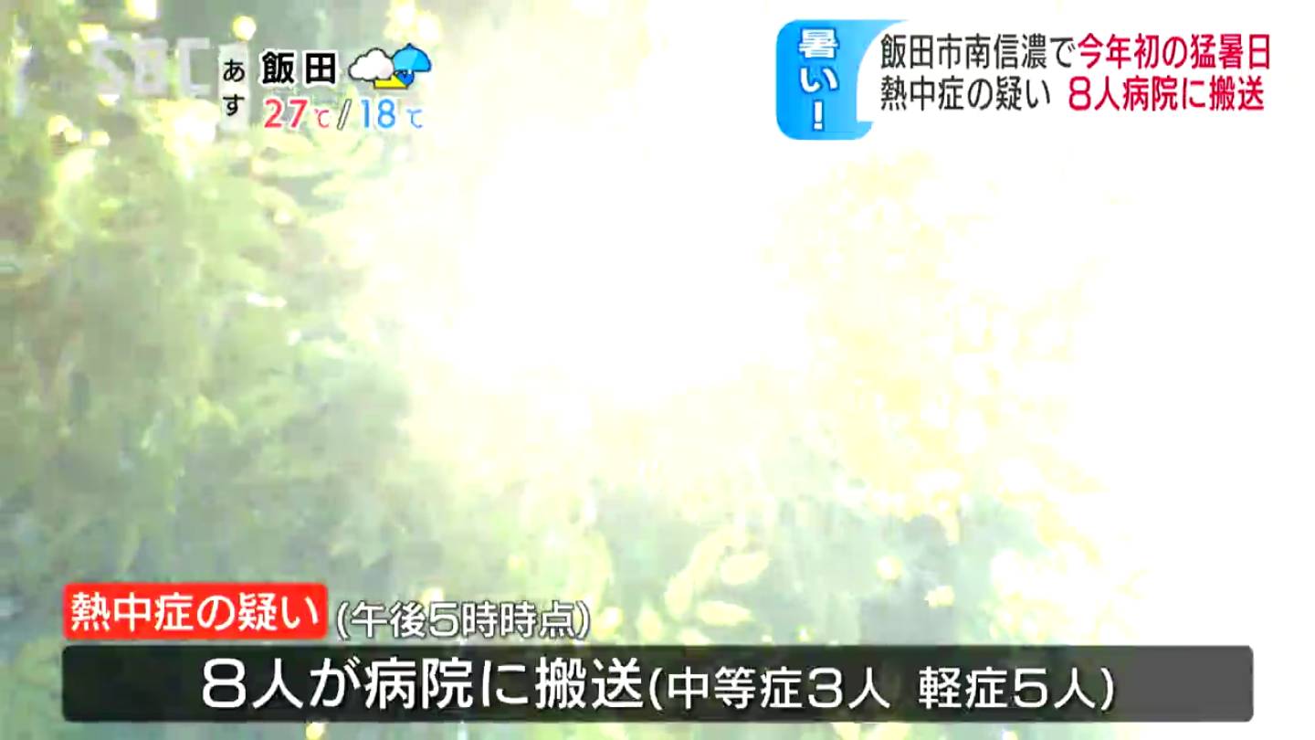 この暑さで、県内では午後5時までに少なくとも8人が熱中症の疑いで病院に運ばれ、このうち3人が中等症、5人が軽症となっています。
