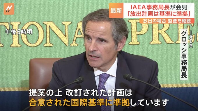 福島第一原発の処理水の安全性について検証を行ってきたIAEA=国際原子力機関のグロッシ事務局長は会見で、「国際的な基準に準拠している」と述べました。IAEA グロッシ事務局長「提案の上、改訂された計画は合意…