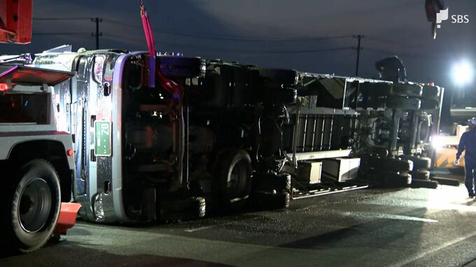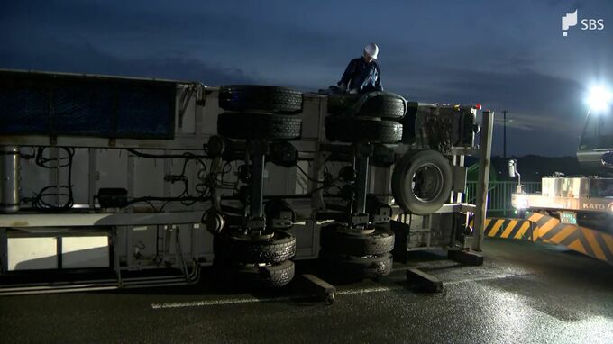 トレーラーは運転席側に倒れる形で横転しました。掛川市危機対策課によりますと、トレーラーを運転していた30代の男性が右腕を打撲するなどの軽傷で病院に運ばれました。