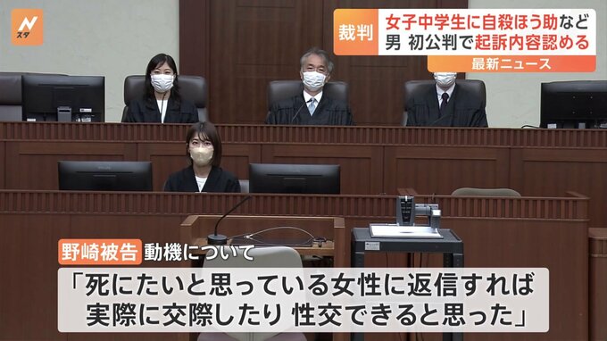 SNSで知り合った女子中学生にみだらな行為をし、自殺するのを手助けしたなどの罪に問われた男が、初公判で起訴内容を認めました。野崎祐也被告(29)は去年9月、SNSで知り合った横浜市の女子中学生をわいせつ目的…