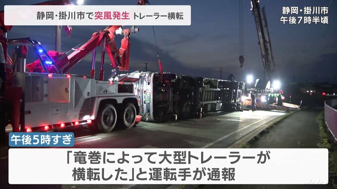 きょう夕方、静岡県掛川市で竜巻とみられる突風が発生し、トレーラーの横転や小屋が吹き飛ぶなどの被害が確認されています。地元の消防などによりますと、きょう午後5時すぎ、掛川市千浜で「竜巻によって大型トレ…