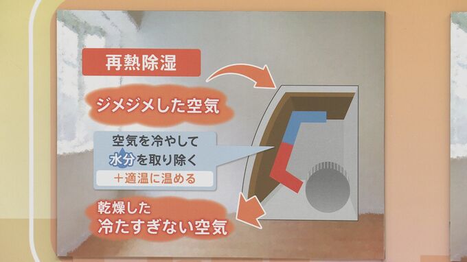 一方、「再熱除湿」は、冷やして水分を取り除くところまでは同じなんですが、もう1回温めることで、乾燥した冷たすぎない空気が出てくる。