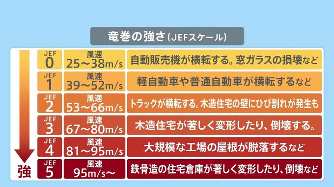 竜巻の強さは藤田(JEF)スケールという基準があり、風の強さで6段階に分かれています。今回の大型トラックが横転するほどの突風とはどのようなレベルなのでしょうか?
