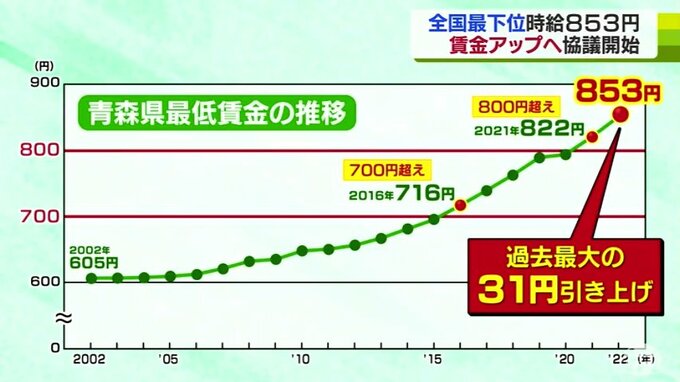 労働者に対して雇用主が最低限支払う最低賃金。青森県では現在、時給853円で、去年は過去最大となる31円の引き上げ額となり、2004年から19年連続で上昇しています。物価高騰が続く中、今年の動向が注目されます。